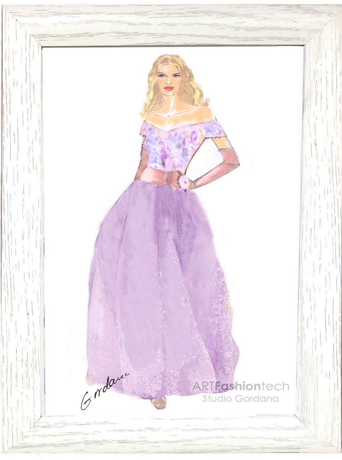 Modna ilustracija na bijelom papiru (80 g/m2), originalni crtež autorice i dizajnerice Gordane Drenovac , izveden u mix medija tehnici koja uključuje print crteža na ink jet pisaču te ručno crtanje i bojenje flomastrom , drvenim bojama i pastelom . Crtež je unikat , ručno potpisam i samo jedan unikat . Naznačen redni broj izdanih crteža iz iste serije.