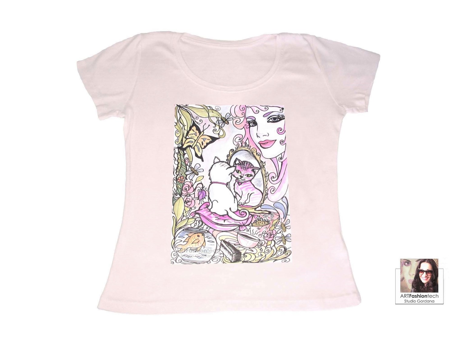 Ženska majica s tiskom originalne autorske ilustracije , 100%pamuk . Kao modna ilustracija -slika je original i unikat autorice i dizajnerice Gordane Drenovac te su majice izrađene u limitiranoj seriji . Slika – tisak izrađen je na digitalnom tiskarskom stroju za tekstilni tisak . Limitirana serija uključuje izradu jednog ili male količine istih proizvoda po specifičnoj naruđbi .