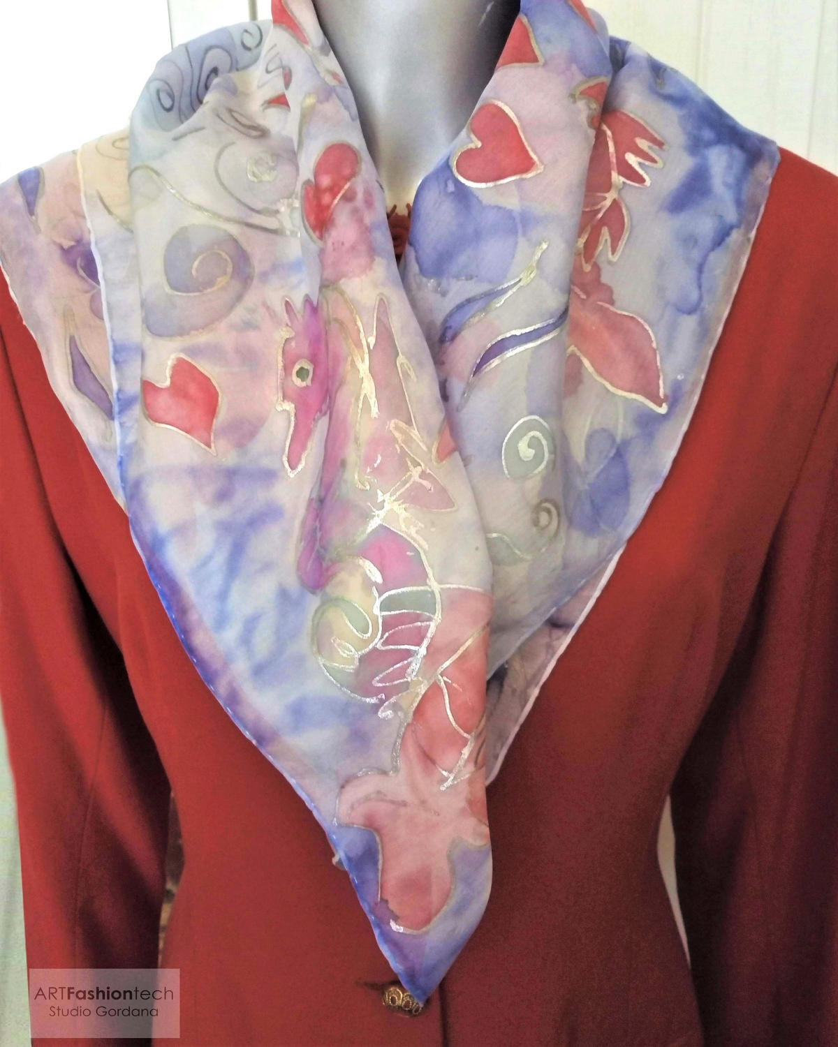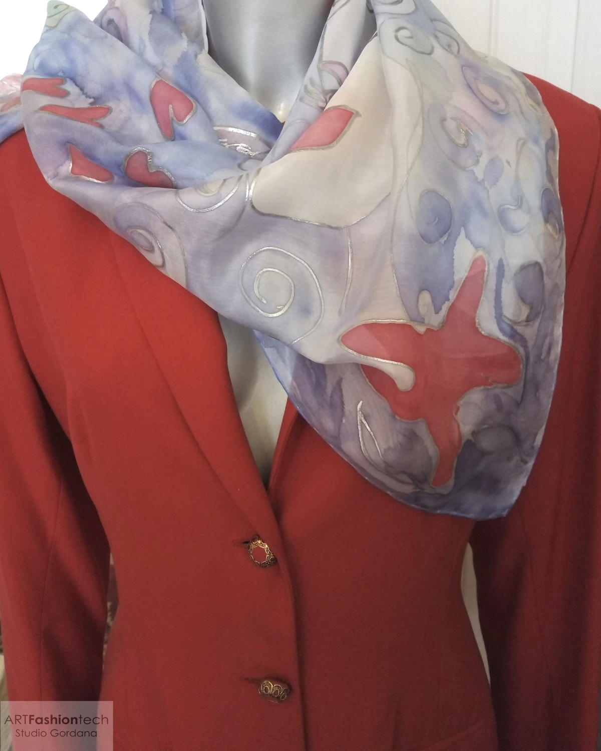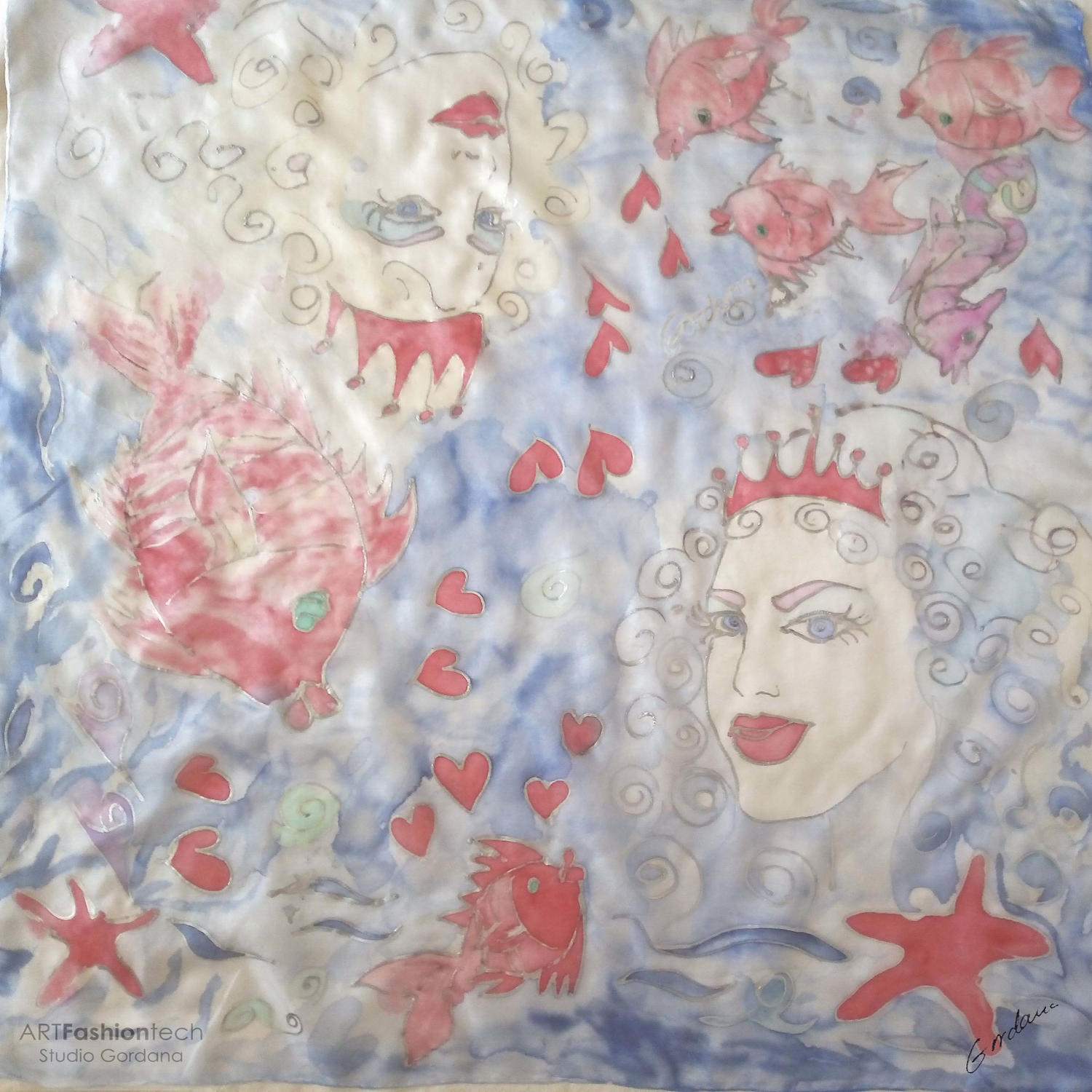 Ženska marama ručno oslikana 100%prirodna svila kao modna ilustracija -slika na svilenoj tkanini je original i unikat . Slika je autorice i dizajnerice Gordane Drenovac , crtež i boje za svilu na 100% svili , ( pongue 5) te ručno oslikana bojama za svilu svijetlo plave , koraljno crvene , pastelne boje , sa srebrnim efektnim kontrastnim obrubnim linijama , te predstavlja originalni rad - unikat . Izrađena je u ograničenom broju sličnih primjeraka ,ručno potpisana i naznačen redni broj sličnih izdanih marama - ilustracija iz iste serije . Limitirana serija uključuje ograničen broj sličnih unikatnih modnih ilustracija , te je naveden njihov broj .